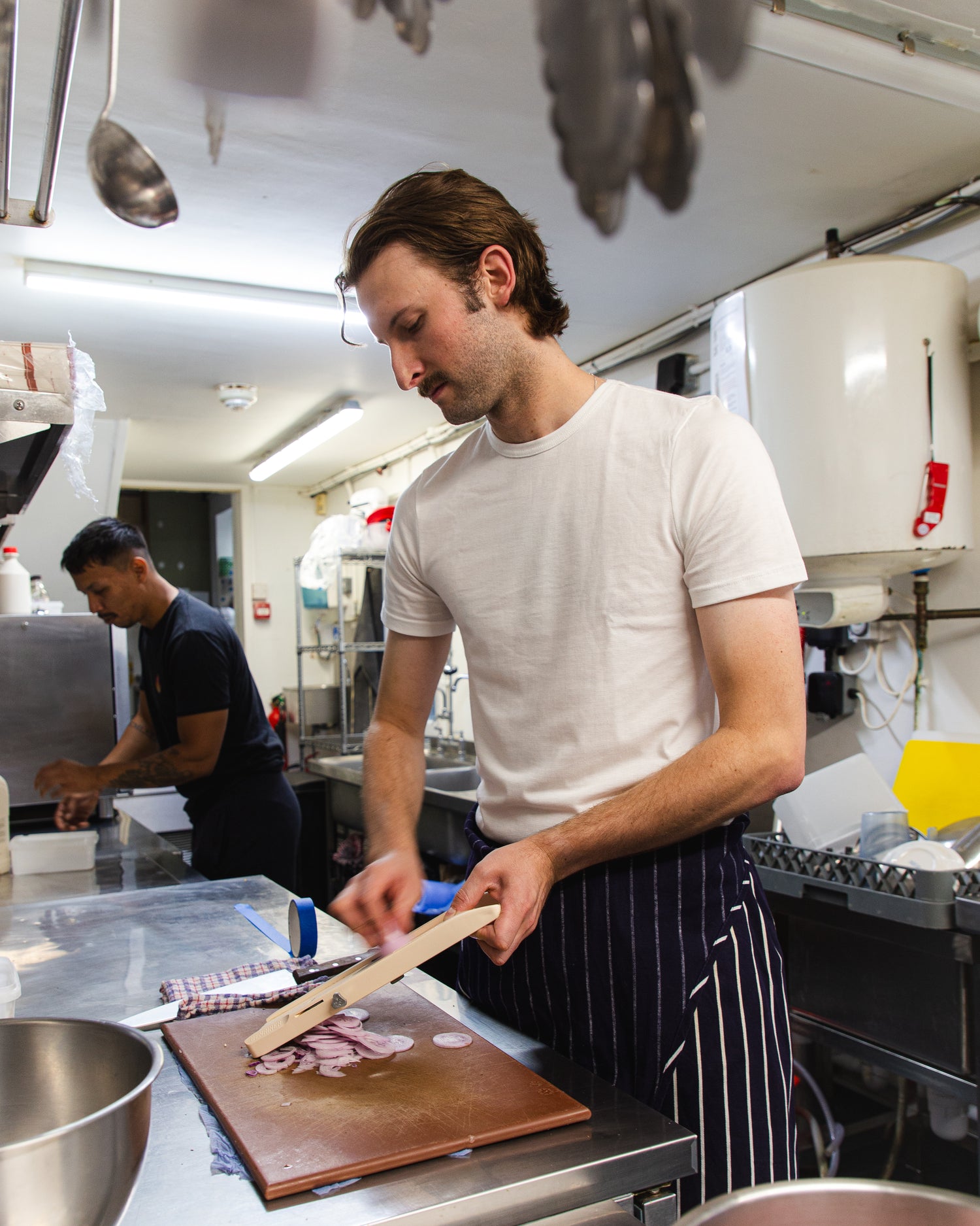 We recreated some of the most iconic shots from FX's "The Bear", using Merz b. Schwanen's '215 Loopwheeled t-shirt' as worn by Carmy in the show.