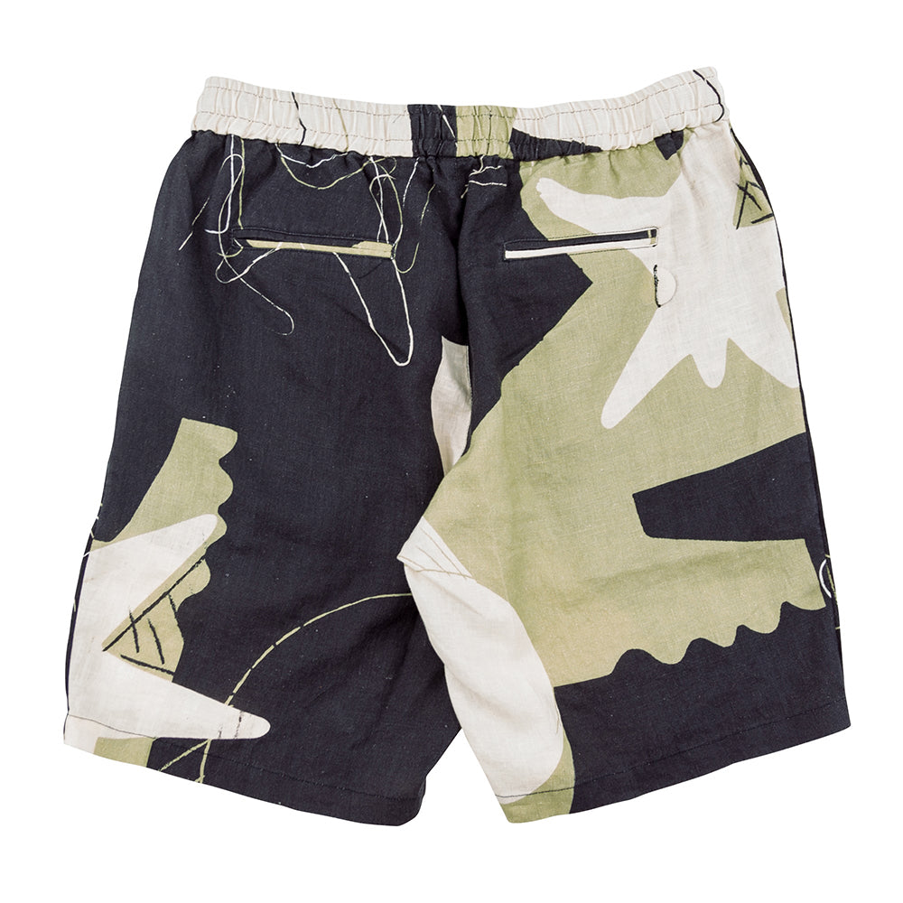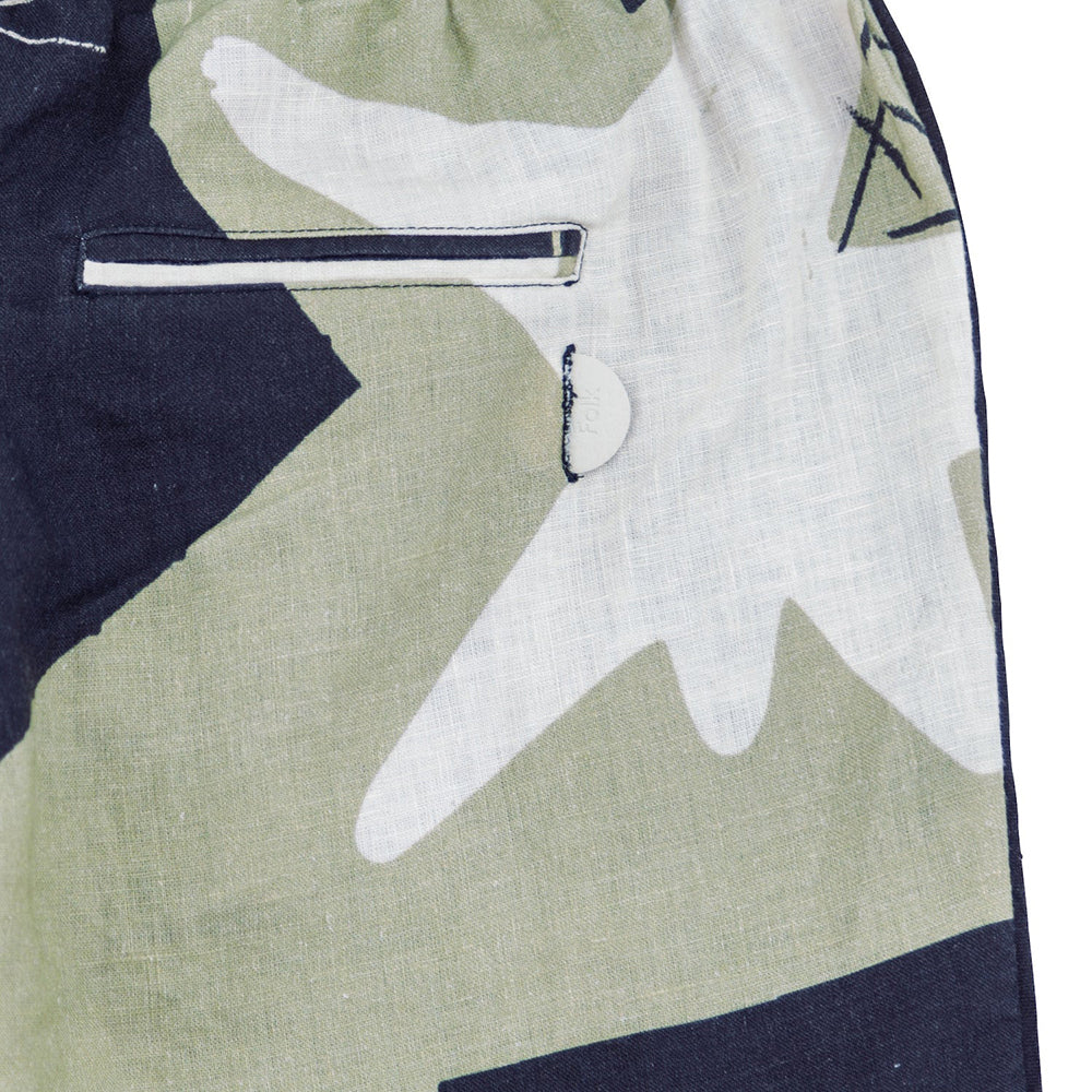 Elasticated waistband in self fabric, with drawcords finishing internally through embroidered eyelets.